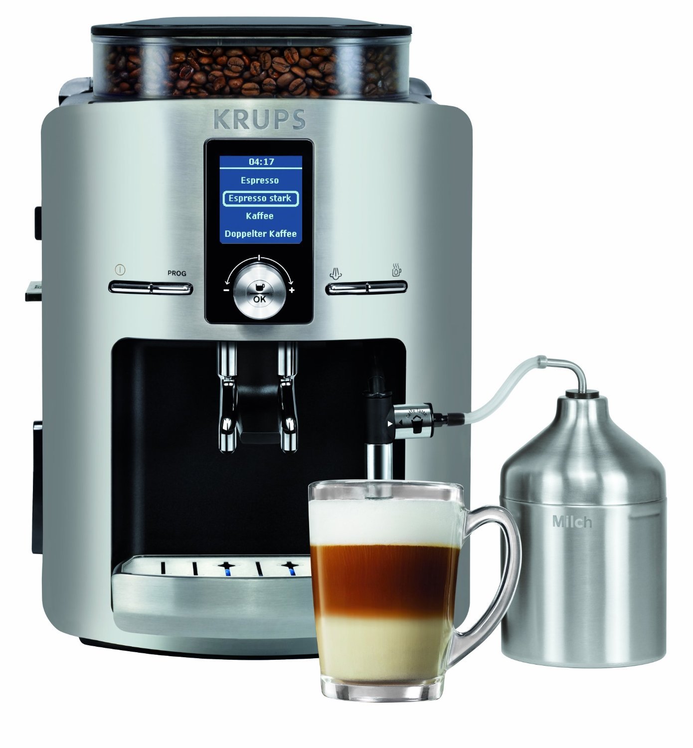 Der Bohnenbehälter rangiert mit 275g Fassungsvermögen im Mittelfeld, der Wassertank mit 1,8l Volumen im gehobenen Mittelfeld. Mittels programmierbarer Ein- und Abschaltautomatik verlassen sie nie mehr das Haus bei noch laufender Kaffeemaschine. Die beheizbare Tassenabstellfläche trägt zum perfekt temperierten Kaffee bei. Zusammenfassend gesagt erhält man für 419€ einen sehr guten Kompakt-Vollautomaten, der beinahe jeden Nutzer zufrieden stellen sollte, die einfache Bedienbarkeit mittels Aluminium Drehregler und farblich unterlegtem Display machen den Automaten zu einem wahren Alleskönner im mittleren Preisbereich.